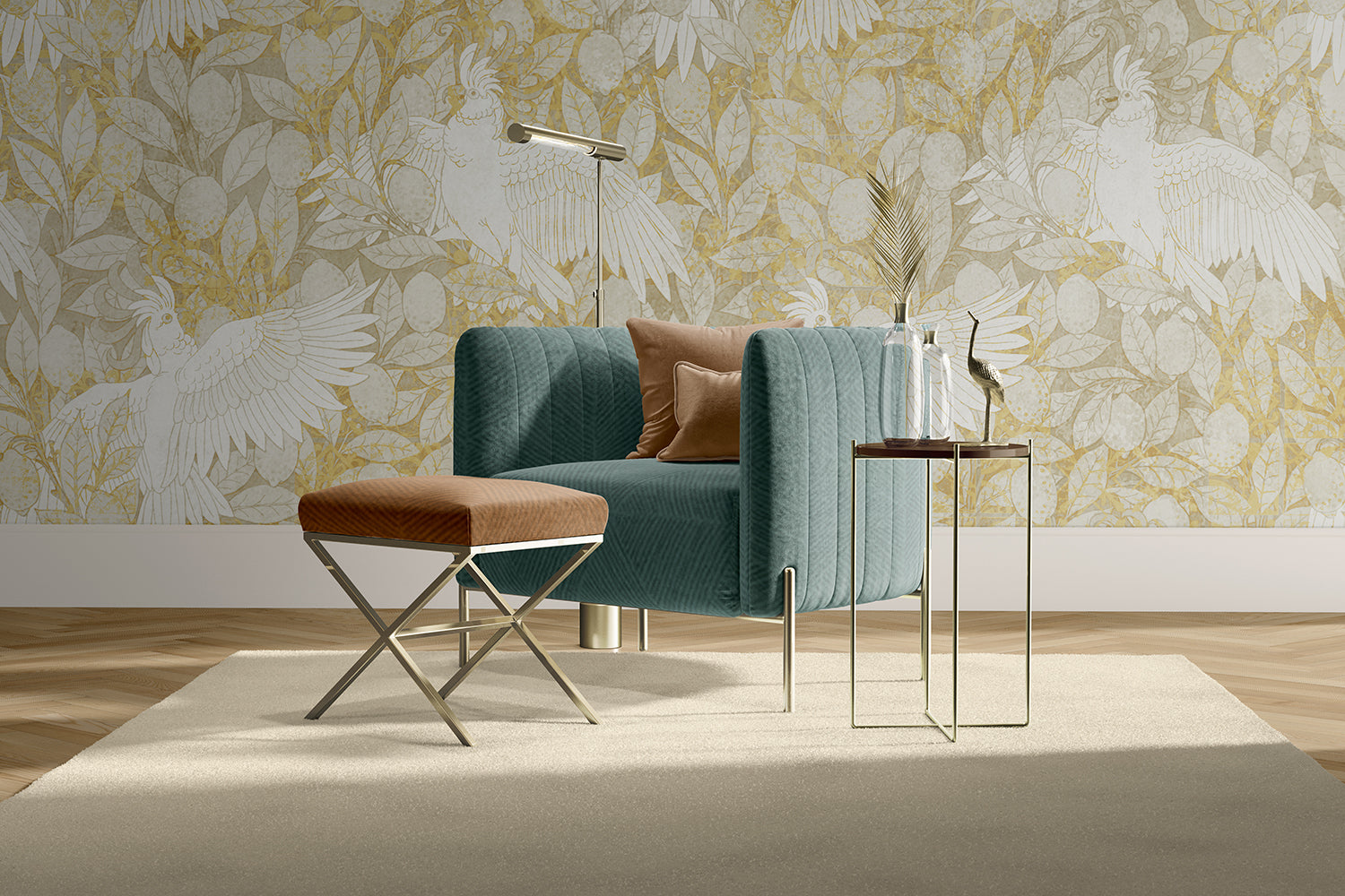 This representation harmoniously combines the leaves of the lemon tree, the flagship fruit of Moroccan markets, with the opulence of the colors of the cockatoo's crest, symbol of the beauty of life. A composition that evokes the richness of this region, in sumptuous refinement, endowed with a balanced and serene balance.