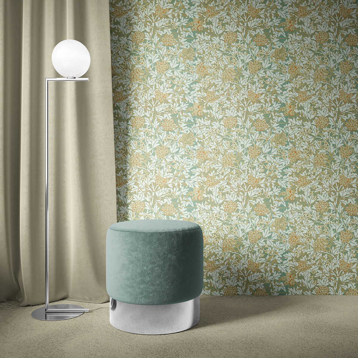 Quinsaï revisits a great classic pattern, created in 1872 by William Morris. Jasmine and hawthorn recolors the complex background pattern of this wallpaper in soft colors, and rethinks its harmony by creating levels of depth and layering with a modern visual signature. The original inspiration is skillfully preserved and is enhanced by a wealth of details, shadows and colors, which give life to a particularly balanced creation. The endless lines of Jasmine and hawthorn will guide the viewer to the depths of their own thoughts.