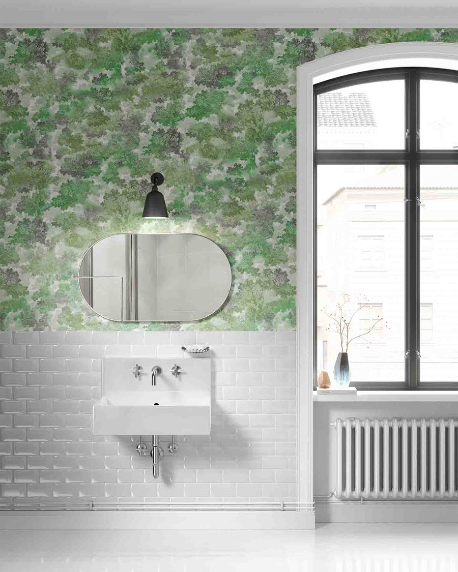 Vegetation, undergrowth, leaves, the mist of a fertile forest, with a mysterious atmosphere, where the density and gradients of colors create an atmosphere rich in textures and nuances inviting a total immersion in nature. This pattern brings a touch of serenity and vitality to any space, creating a relaxing and inspiring atmosphere.