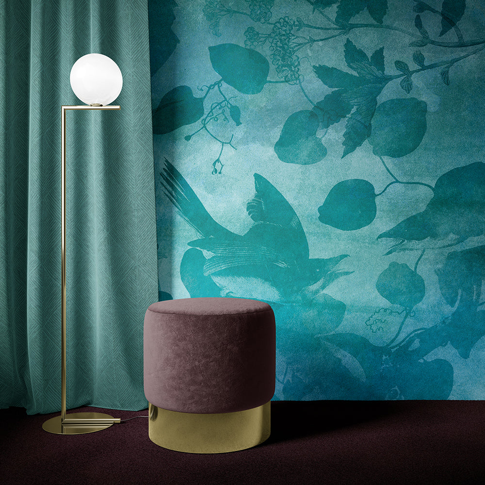 Like a Chinese shadow game, Zoothera combines the outline of thrushes blending among fine flowering branches. The almost geometric layout of the whole is reminiscent of the delicate folding of tissue paper.