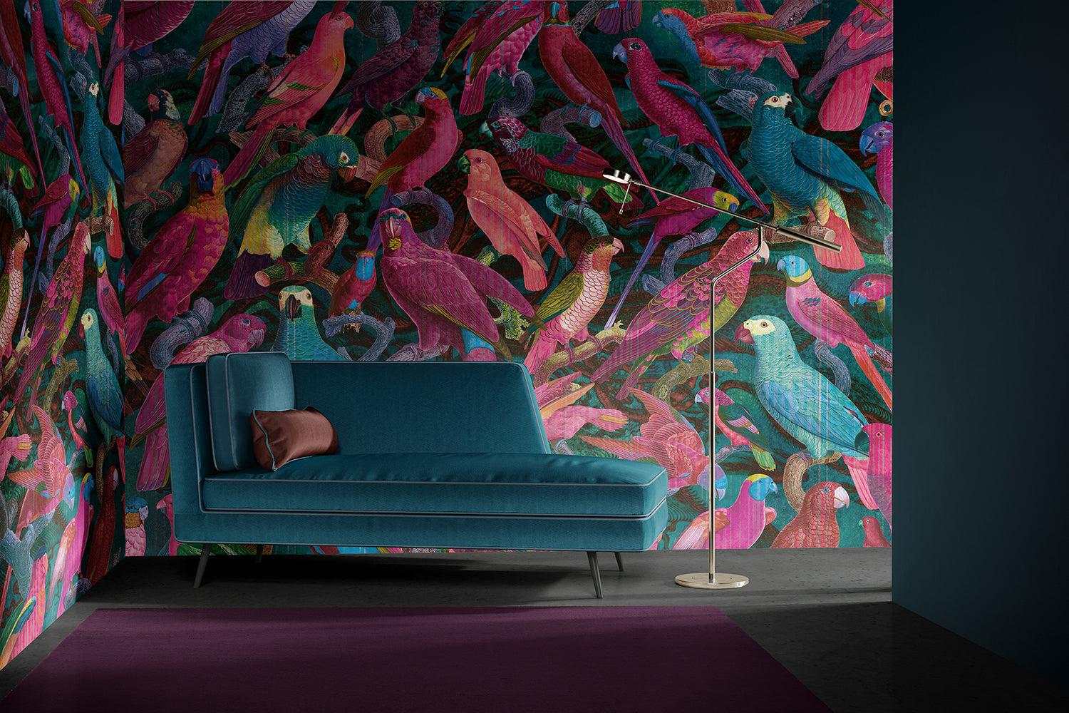 Sur cette fresque tropicale, des centaines de perroquets multicolores sont posés sur des branches et semblent parader, offrant aux regards leur plumage chatoyant. Chacun des oiseaux est minutieusement représenté, donnant à l’ensemble un tableau exotique et réaliste très original.